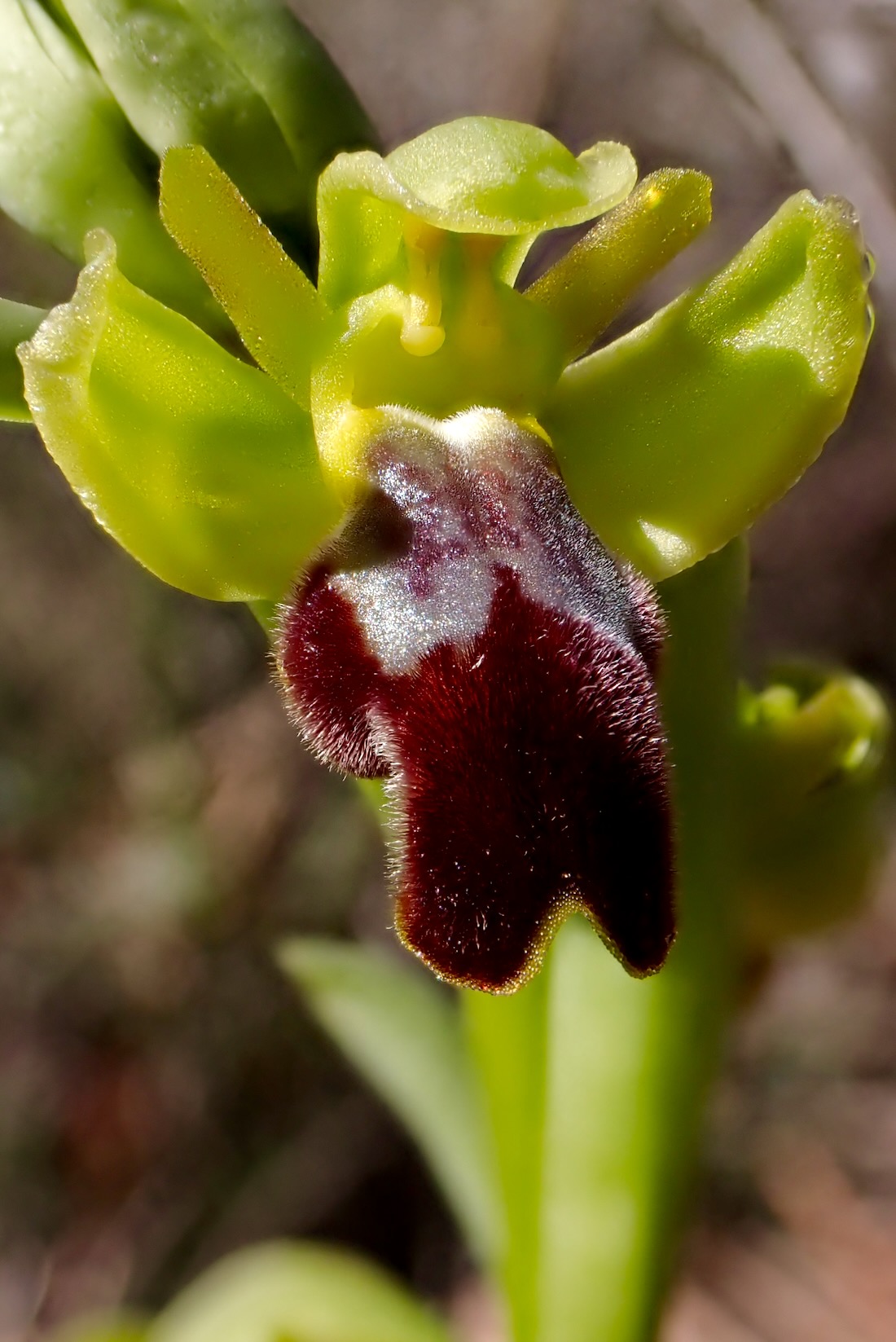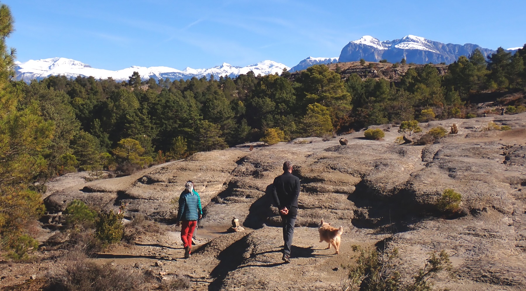 Caminando entre bojes, pinos y enebros retorcidos, descubrimos las primeras Ophrys fusca de la temporada. Enseguida alcanzamos una amplia repisa de roca. Un balcón corrido con vistas al Pirineo que parece tallado a golpe de pico y cincel por un cantero de otra era. Un mirador que invita a sentarse bajo el sol de la mañana y admirar el paisaje.