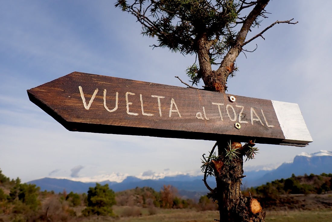 Más arriba, un pino delgado e imberbe sostiene un cartelito de madera. A la izquierda, "Vuelta al Tozal". A la derecha, "Santa María de Buil".