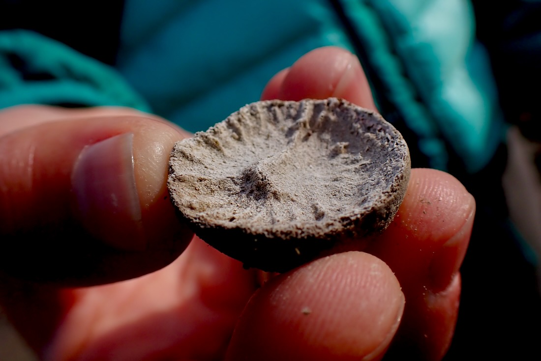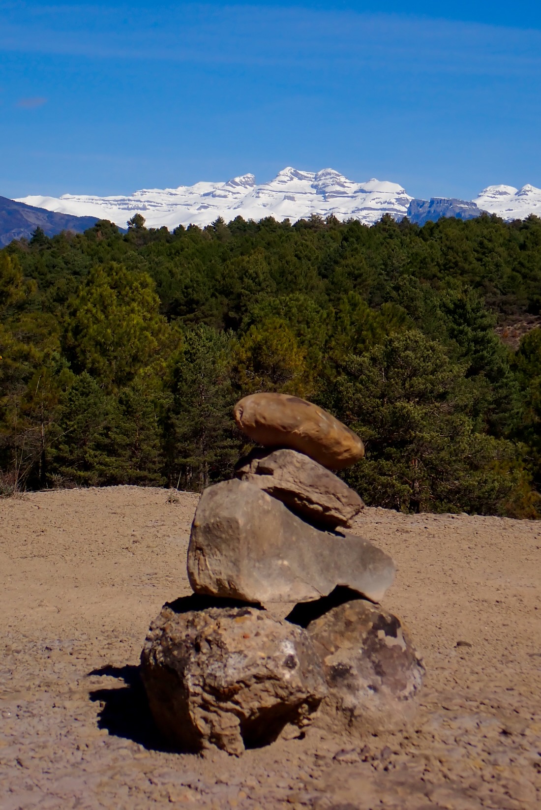 Seguimos por la izquierda y los hitos de piedras amontonadas por los duendes nos guían a través de un mar de olas petrificadas y grandes depósitos de Nummulites. La entretenida senda continúa circunvalando el cerro, ganando altura poco a poco, sorteando pequeños barrancos, esquivando grandes bloques de roca que adoptan formas diversas y estimulan nuestra imaginación.